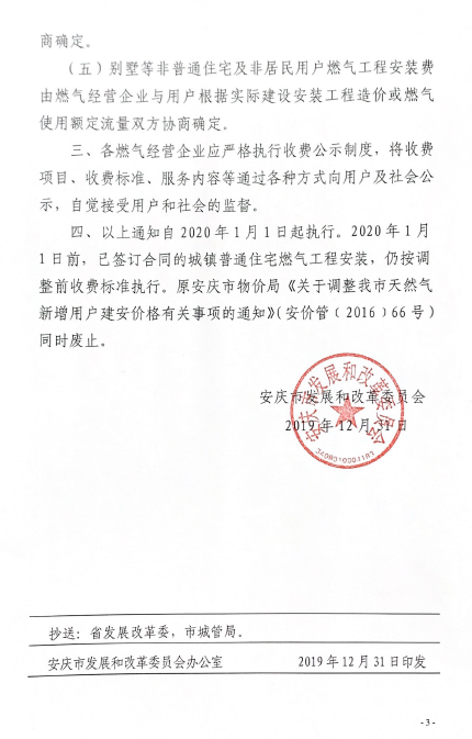 安慶市發(fā)展改革委關(guān)于規(guī)范我市天然氣新增用戶燃?xì)夤こ贪惭b收費(fèi)標(biāo)準(zhǔn)的通知(2019)