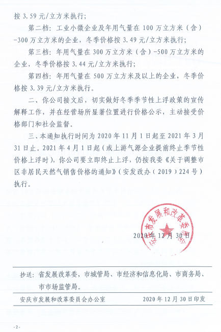 安慶市發(fā)展改革委關(guān)于順價疏導(dǎo)冬季非居民工商業(yè)用氣價格的通知(2020)