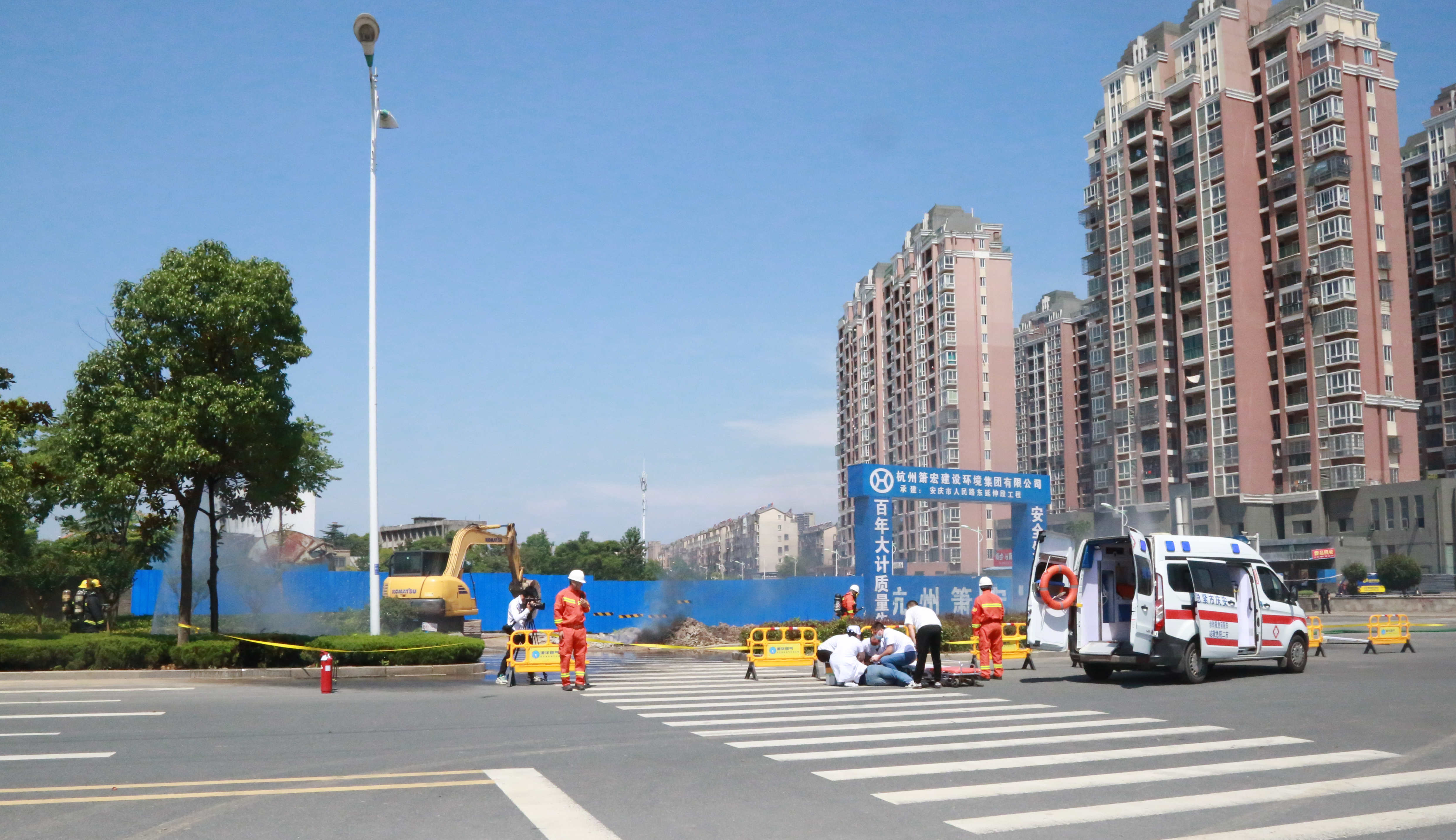 本次演練現(xiàn)場模擬了因第三方施工單位違章作業(yè)挖破安慶市迎江區(qū)獨秀大道水岸花都小區(qū)南側(cè)(獨秀大道與華中東路交叉口南行約200米)的地下中壓天然氣管道,引發(fā)天然氣泄漏后遇火源發(fā)生爆燃,造成多名人員受傷,同時泄漏的燃氣還竄至附近水岸花都小區(qū)市政管網(wǎng),隨時可能引發(fā)爆炸事故,威脅小區(qū)約3000戶居民及商戶生命財產(chǎn)安全。接到報警電話后,安慶港華燃氣與市公安局、市消防救援支隊、市衛(wèi)健委、迎江區(qū)政府、龍獅橋鄉(xiāng)政府等單位及時組織力量趕赴現(xiàn)場,并按照《安慶市城市燃氣事故應(yīng)急預(yù)案》要求協(xié)同配合,有序開展現(xiàn)場警戒、群眾疏散、傷員救治、消防救援、搶險搶修等應(yīng)急處置工作。