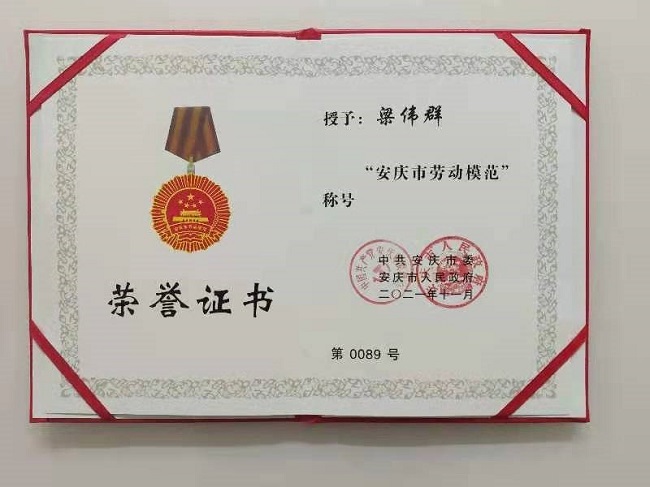 近日,在市委、市政府召開的市勞動(dòng)模范、先進(jìn)工作者和先進(jìn)集體表彰大會(huì)上,公司員工梁偉群被授予“安慶市勞動(dòng)模范”。