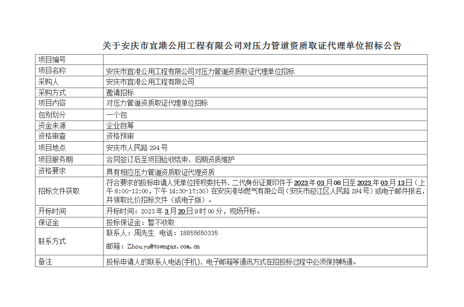 關(guān)于安慶市宜港公用工程有限公司對壓力管道資質(zhì)取證代理單位招標公告