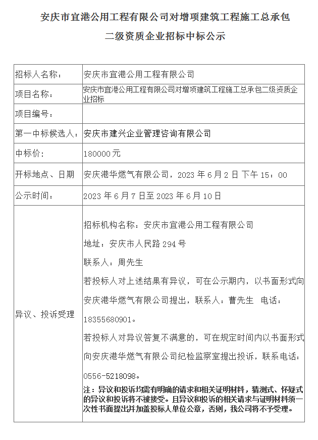 安慶市宜港公用工程有限公司對(duì)增項(xiàng)建筑工程施工總承包二級(jí)資質(zhì)企業(yè)招標(biāo)中標(biāo)公示