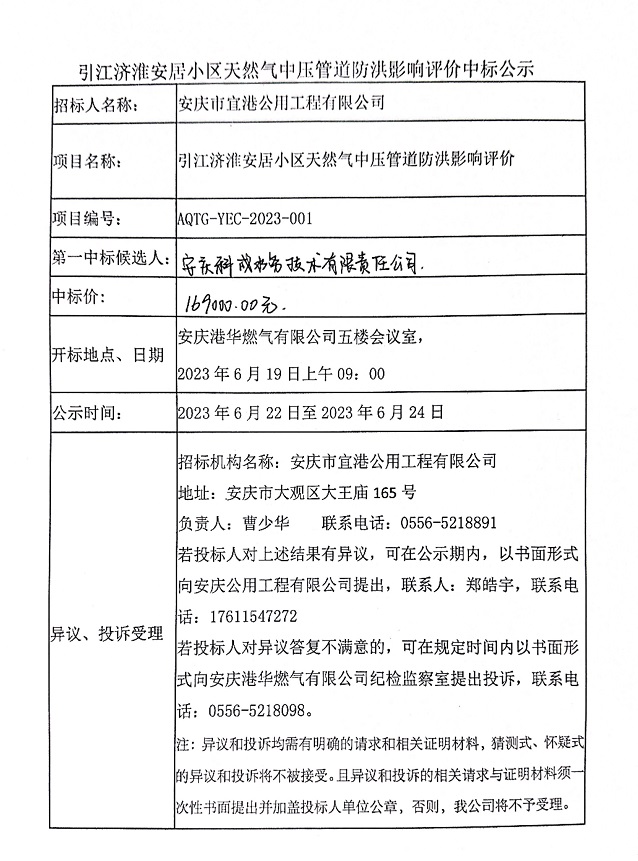 引江濟(jì)淮安居小區(qū)天然氣中壓管道工程防洪影響評價(jià)中標(biāo)公示