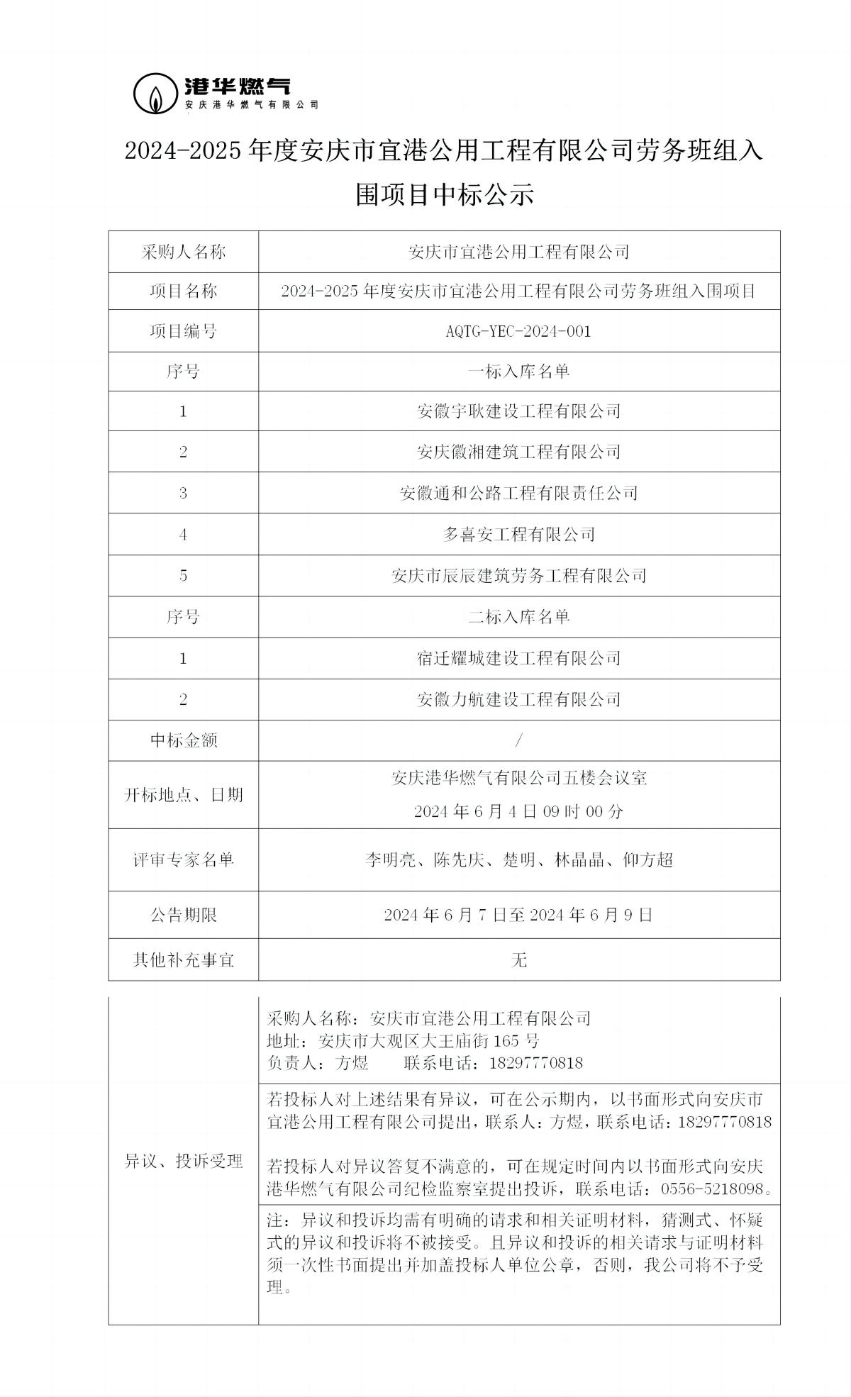 2024-2025年度安慶市宜港公用工程有限公司勞務(wù)班組入圍項目中標(biāo)公示