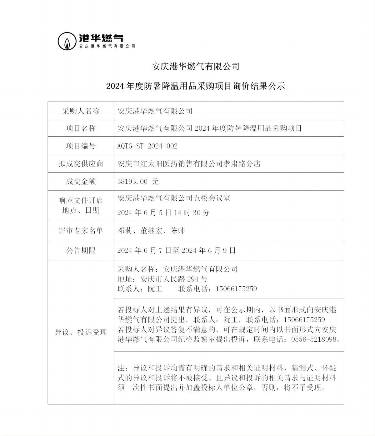 安慶港華燃?xì)庥邢薰?024年度防暑降溫用品采購項(xiàng)目詢價(jià)結(jié)果公示