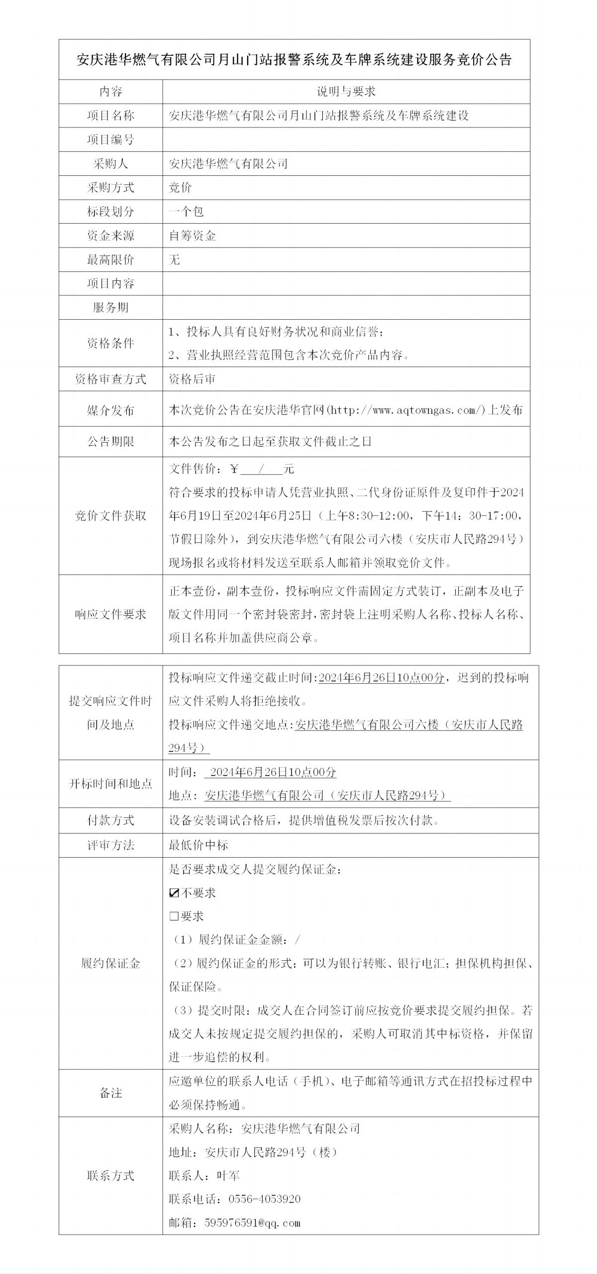 安慶港華燃氣有限公司月山門站報警系統(tǒng)及車牌系統(tǒng)建設(shè)服務(wù)競價公告