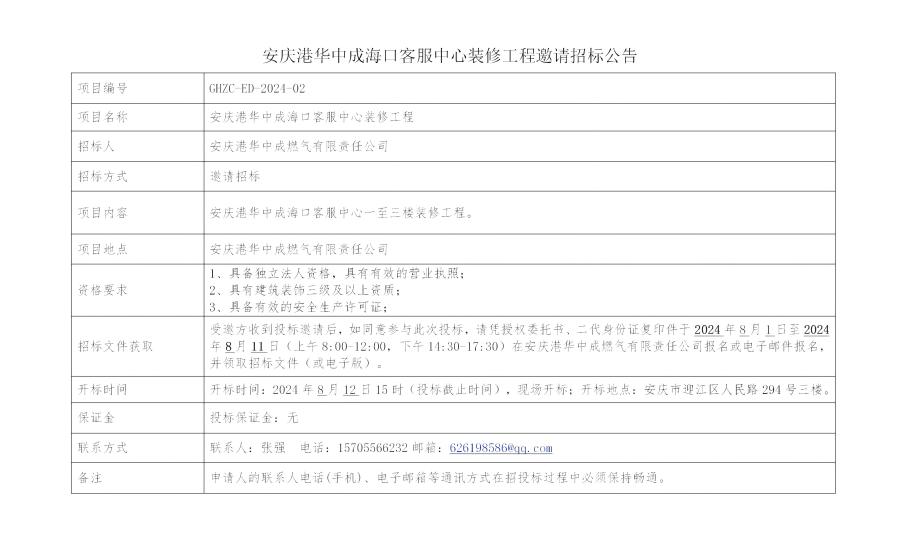 安慶港華中成海口客服中心裝修工程邀請招標公告
