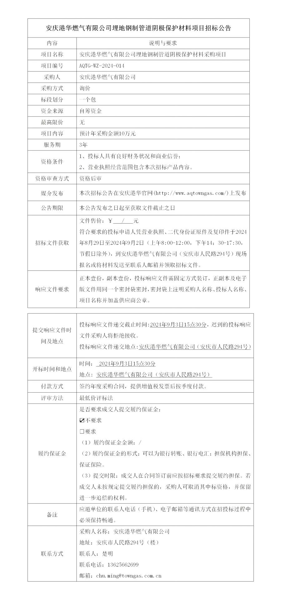 安慶港華燃氣有限公司埋地鋼制管道陰極保護材料項目招標(biāo)公告