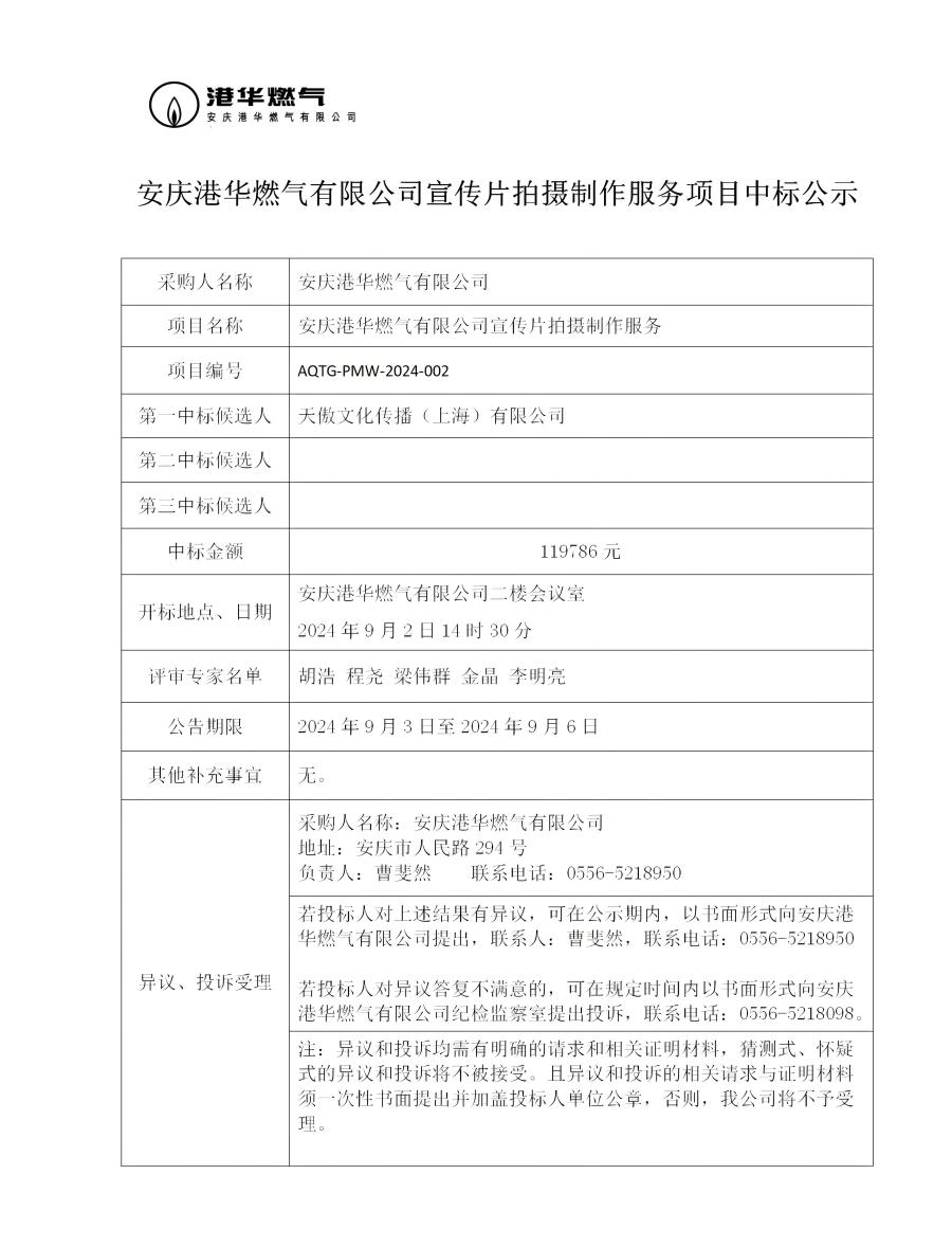 安慶港華燃?xì)庥邢薰拘麄髌臄z制作服務(wù)項(xiàng)目中標(biāo)公示