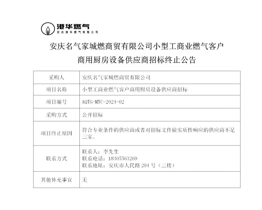 安慶名氣家城燃商貿(mào)有限公司小型工商業(yè)燃氣客戶商用廚房設備供應商招標終止公告