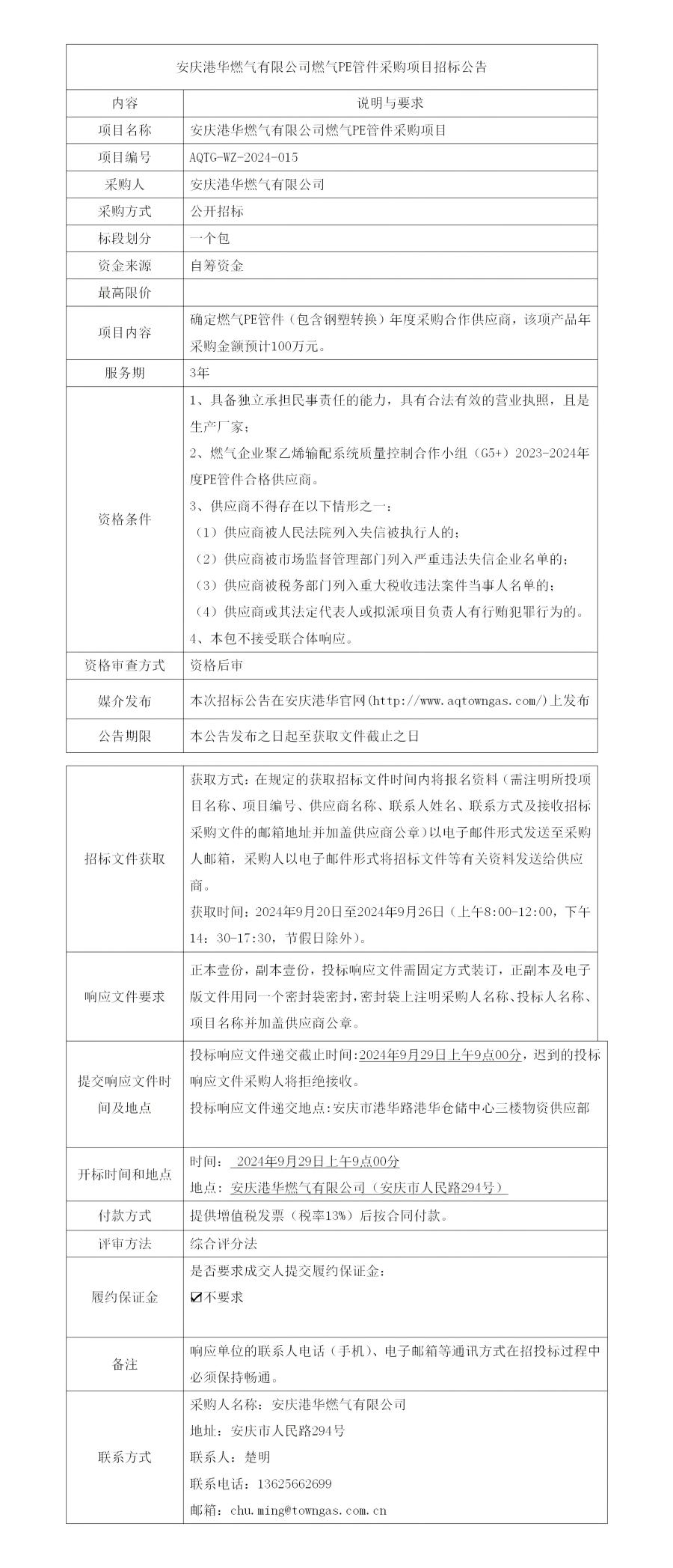 安慶港華燃氣有限公司燃氣PE管件采購項目招標(biāo)公告