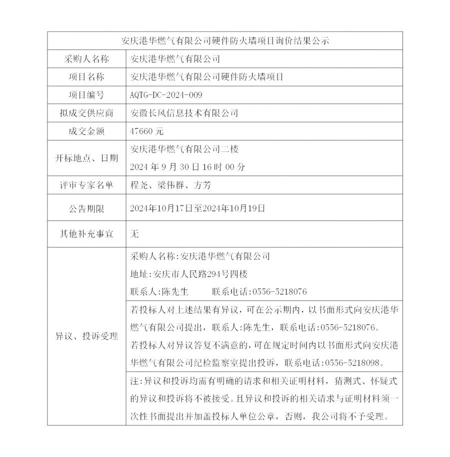安慶港華燃氣有限公司硬件防火墻項目詢價結(jié)果公示 發(fā)布時間:2024-10-17    閱讀次數(shù):2719次