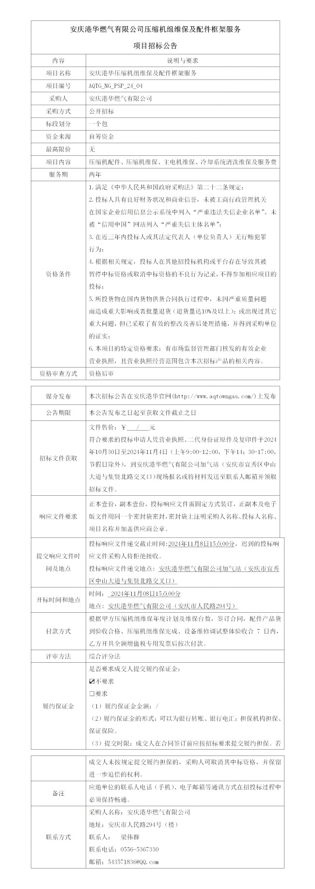 安慶港華燃?xì)庥邢薰緣嚎s機(jī)組維保及配件框架服務(wù)項目招標(biāo)公告