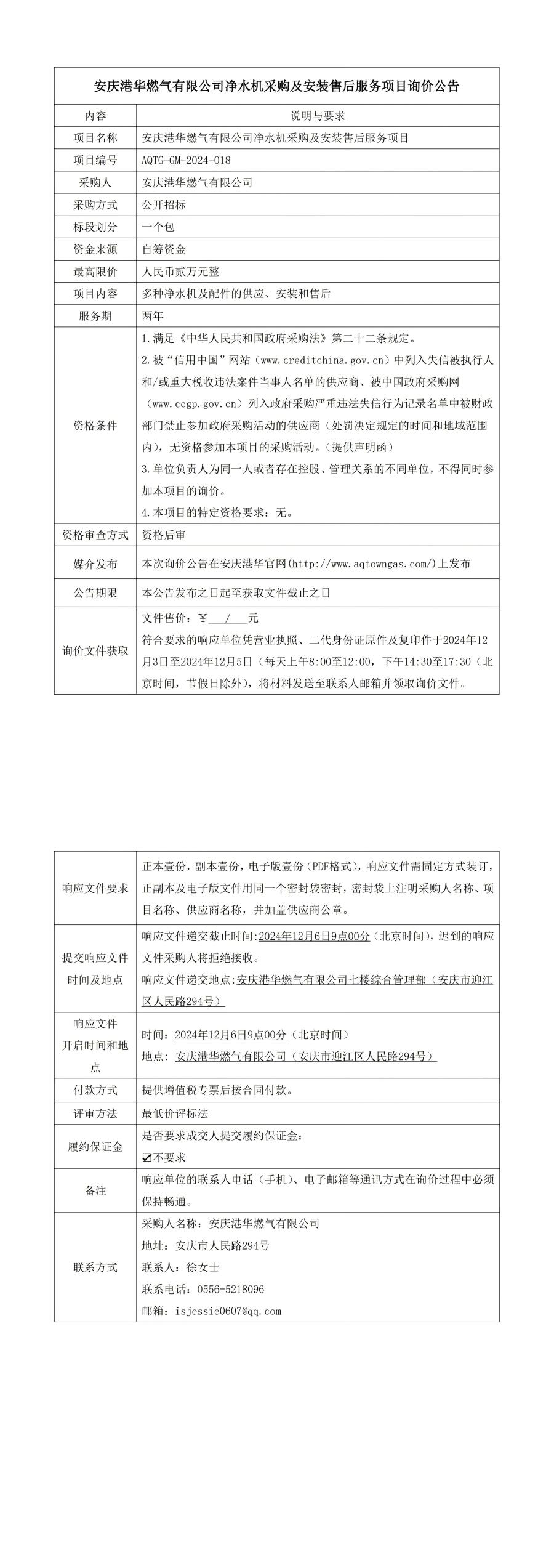 安慶港華燃氣有限公司凈水機采購及安裝售后服務(wù)項目詢價公告
