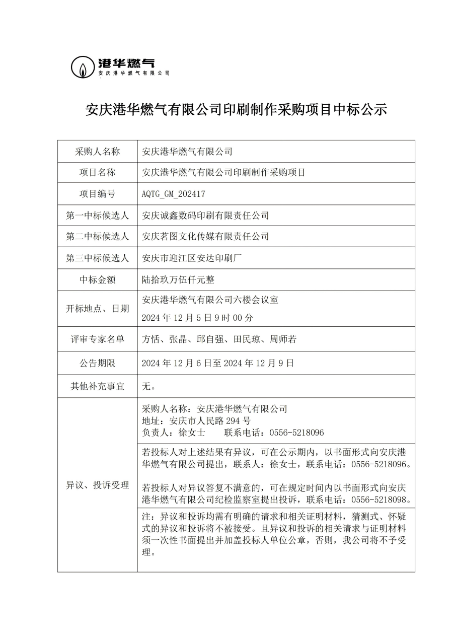 安慶港華燃?xì)庥邢薰居∷⒅谱鞑少忢?xiàng)目中標(biāo)公示