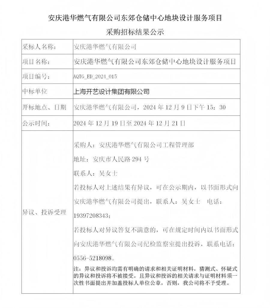 安慶港華燃?xì)庥邢薰緰|郊倉儲(chǔ)中心地塊設(shè)計(jì)服務(wù)項(xiàng)目采購招標(biāo)結(jié)果公示