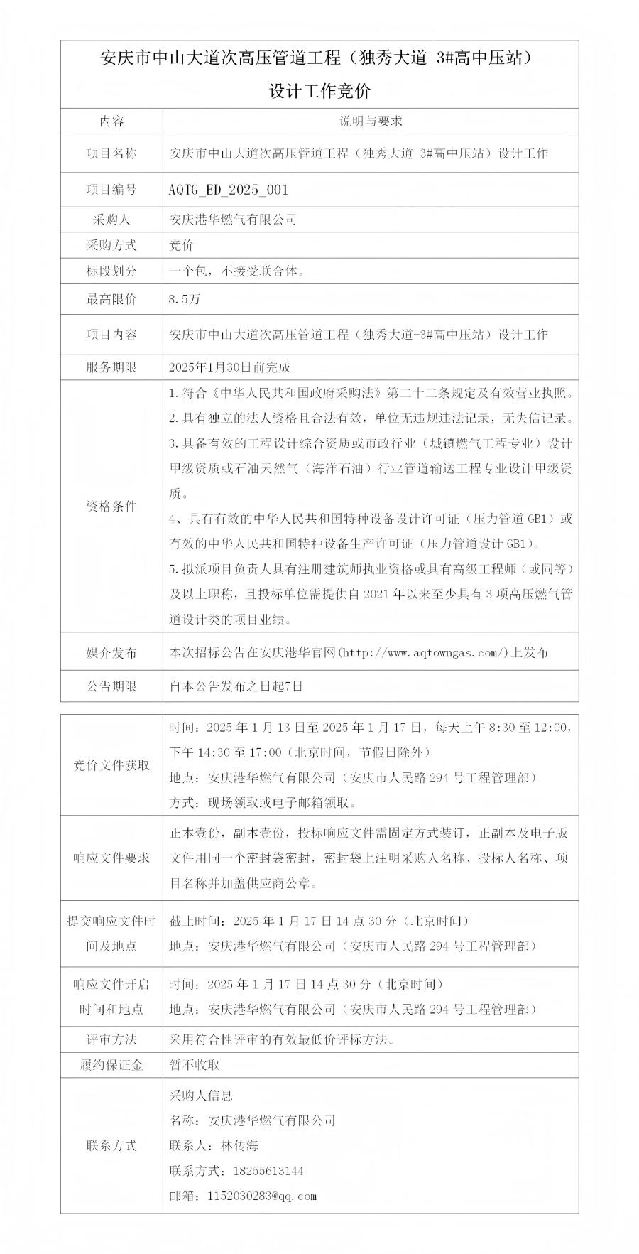 安慶市中山大道次高壓管道工程(獨(dú)秀大道-3#高中壓站)設(shè)計(jì)工作競(jìng)價(jià) 發(fā)布時(shí)間:2025-01-10    閱讀次數(shù):2305次