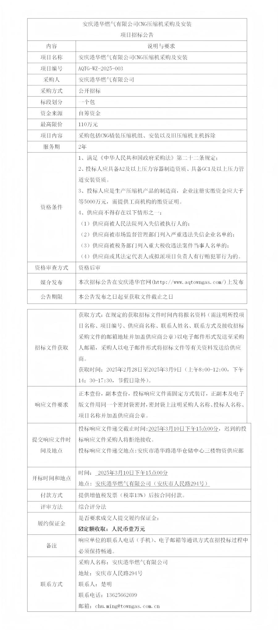 安慶港華燃?xì)庥邢薰綜NG壓縮機(jī)采購及安裝項(xiàng)目招標(biāo)公告
