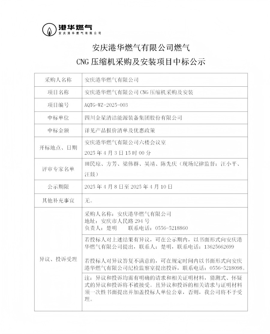 安慶港華燃?xì)庥邢薰救細(xì)釩NG壓縮機(jī)采購及安裝項(xiàng)目中標(biāo)公示