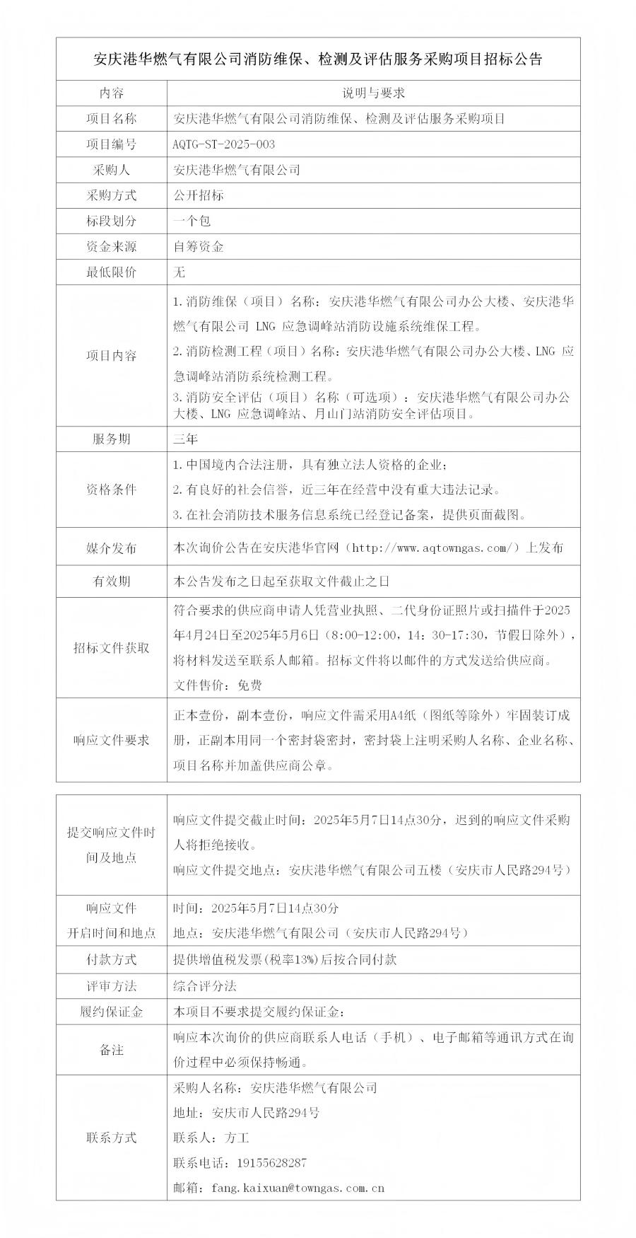 安慶港華燃氣有限公司消防維保、檢測及評估服務(wù)采購項目招標(biāo)公告