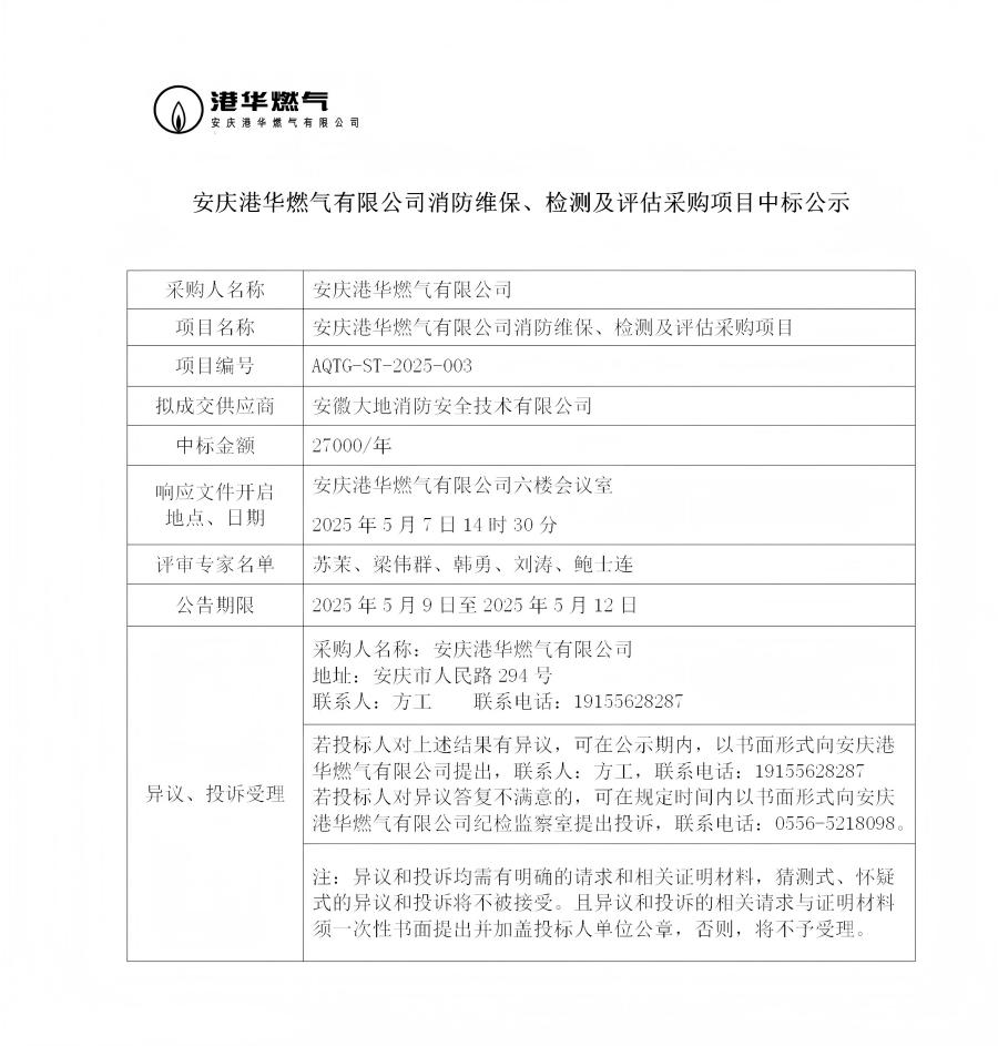 安慶港華燃?xì)庥邢薰鞠谰S保、檢測(cè)及評(píng)估采購(gòu)項(xiàng)目中標(biāo)公示