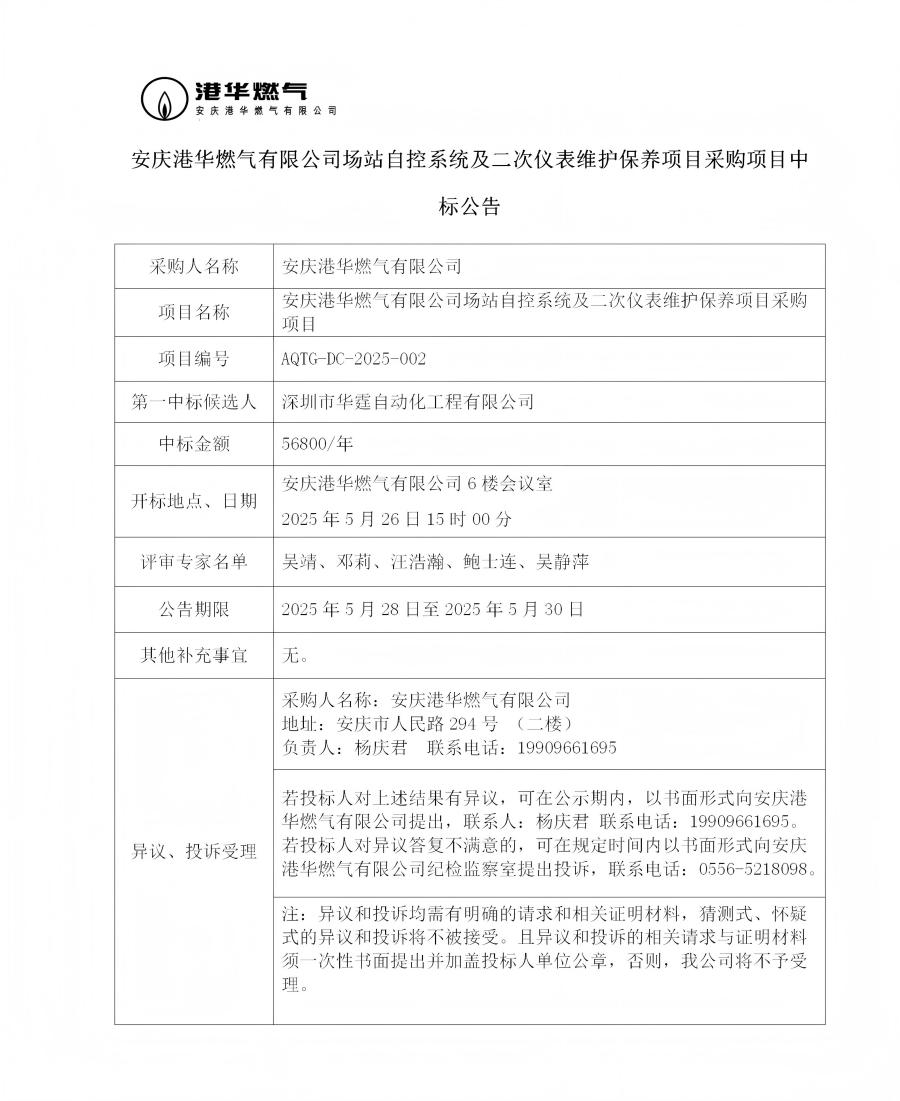 安慶港華燃?xì)庥邢薰緢稣咀钥叵到y(tǒng)及二次儀表維護保養(yǎng)項目采購項目中標(biāo)公告 發(fā)布時間:2025-05-28    閱讀次數(shù):1444次
