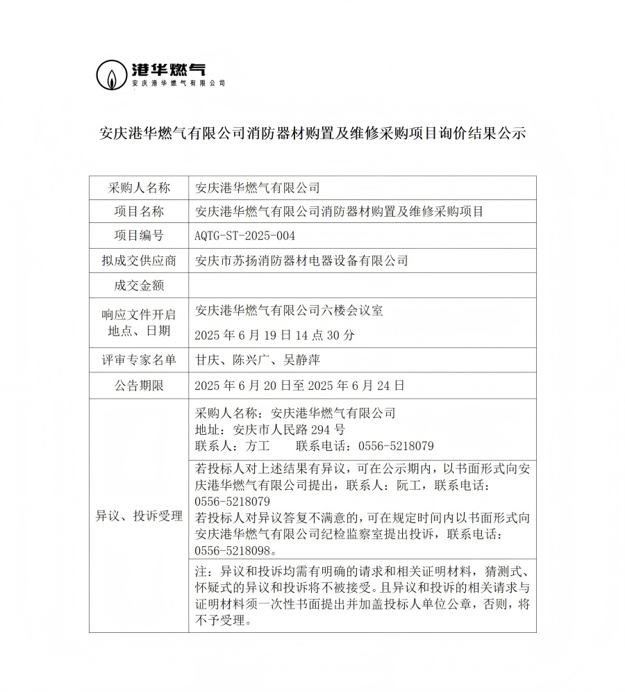 安慶港華燃?xì)庥邢薰鞠榔鞑馁徶眉熬S修采購項(xiàng)目詢價結(jié)果公示