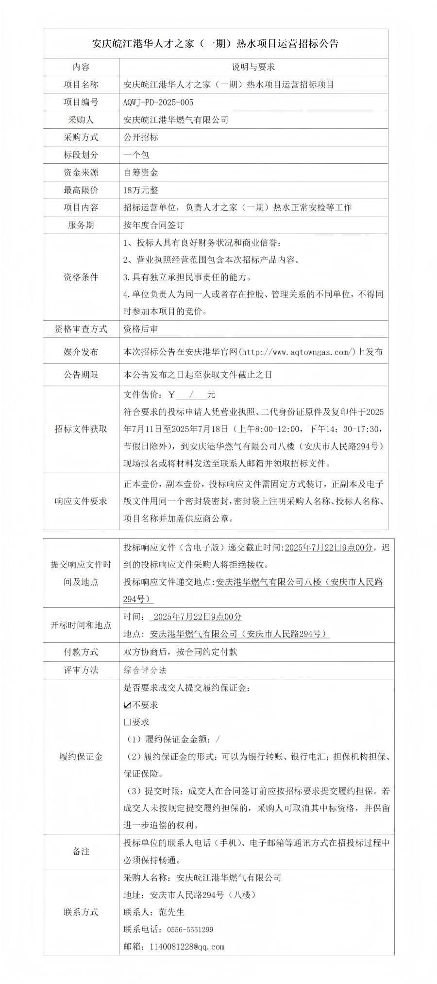 安慶皖江港華人才之家(一期)熱水項(xiàng)目運(yùn)營(yíng)招標(biāo)公告 發(fā)布時(shí)間:2025-07-11    閱讀次數(shù):1250次