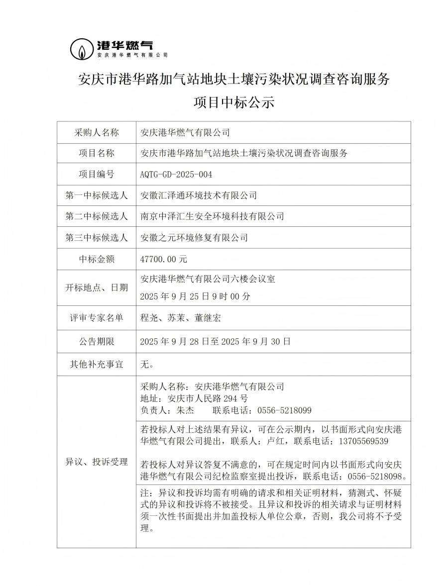 安慶市港華路加氣站地塊土壤污染狀況調(diào)查咨詢服務項目中標公示