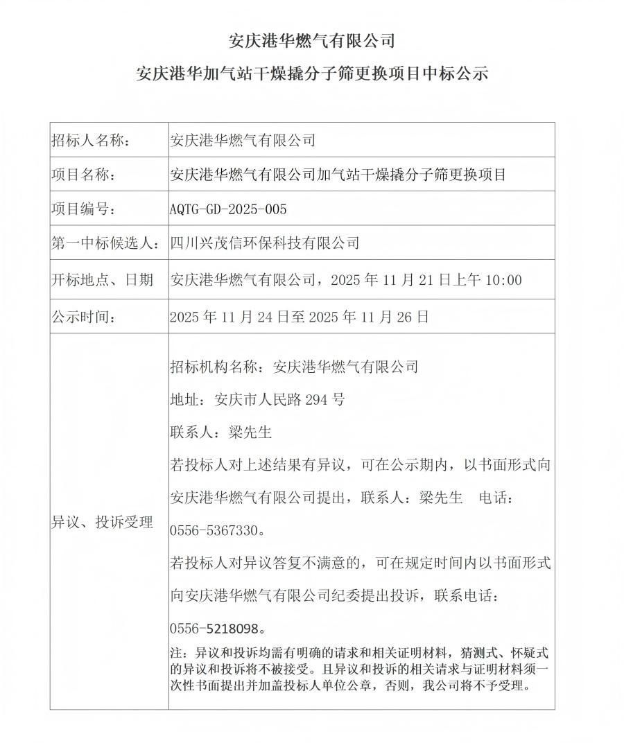 安慶港華燃氣有限公司安慶港華加氣站干燥撬分子篩更換項目中標公示