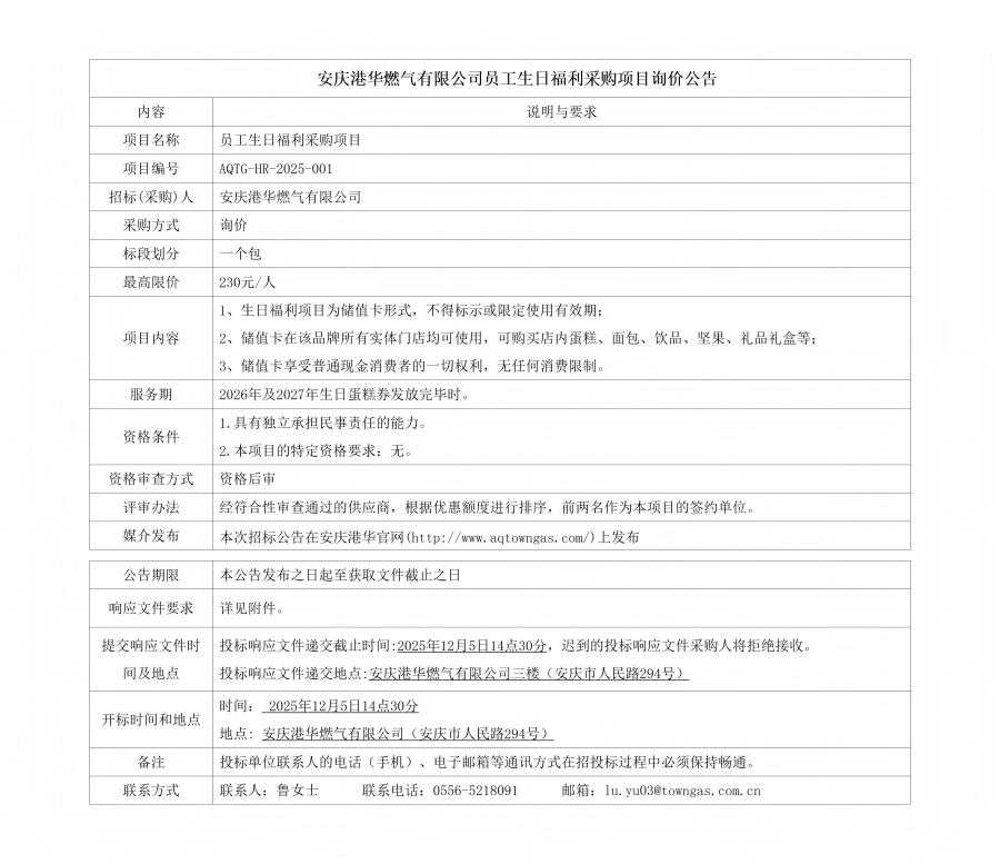 安慶港華燃?xì)庥邢薰締T工生日福利采購項目詢價公告
