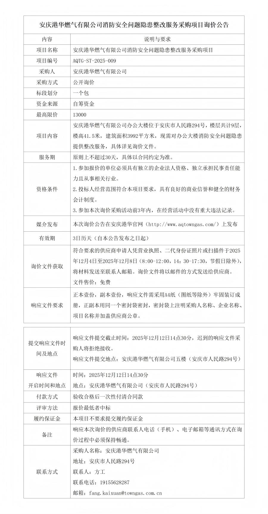 安慶港華燃?xì)庥邢薰鞠腊踩珕栴}隱患整改服務(wù)采購項目詢價公告