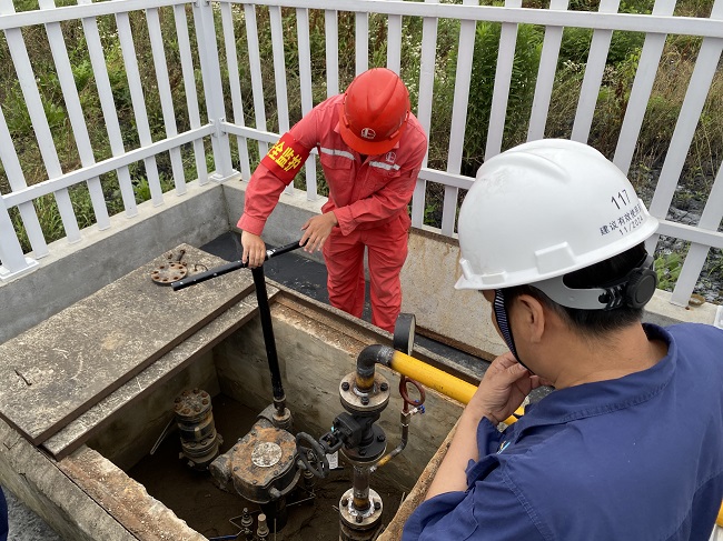 “山口高壓停輸作業(yè)區(qū)域燃?xì)馓铰┸嚨谌螜z測(cè)結(jié)果無異常,可開啟管線4#閥門”,伴隨著來自安慶港華調(diào)度中心的指令,高壓管線與北部新城場(chǎng)站連接的最后一道閥門緩緩開啟,安慶高新區(qū)山口片區(qū)高壓燃?xì)廨斉涔こ谈邏汗芫€順利完成接駁。